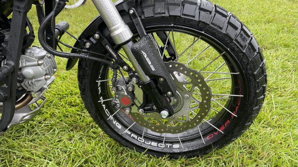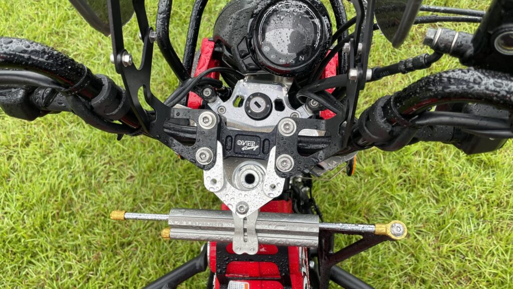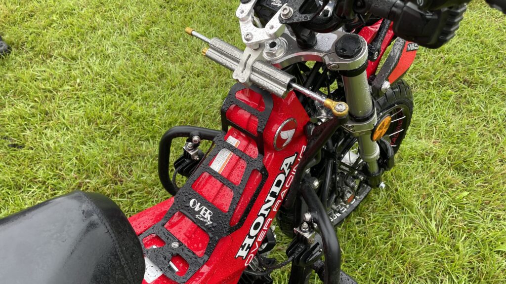 ハンターカブにアップフェンダーを取付すると、タイヤが細いままだと見た目が微妙な感じになりますが、OVERRacingのホイールを装着する事で全体的なバランスが整います。