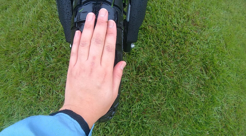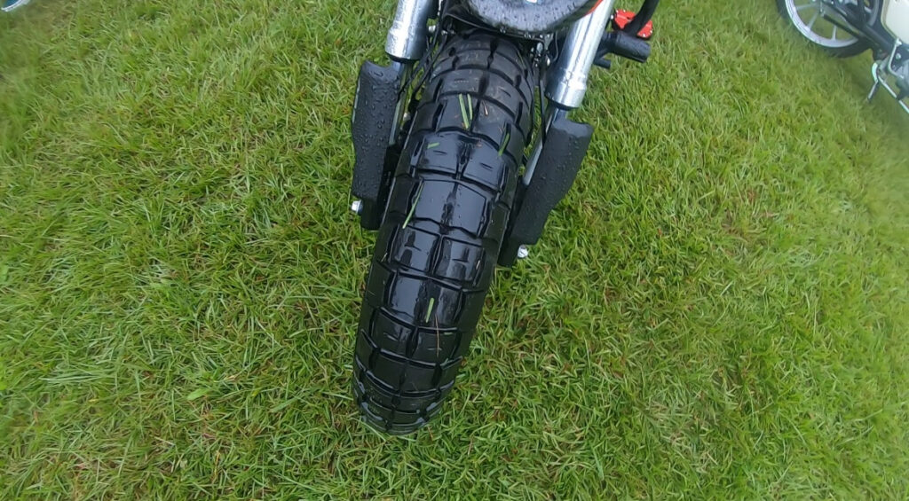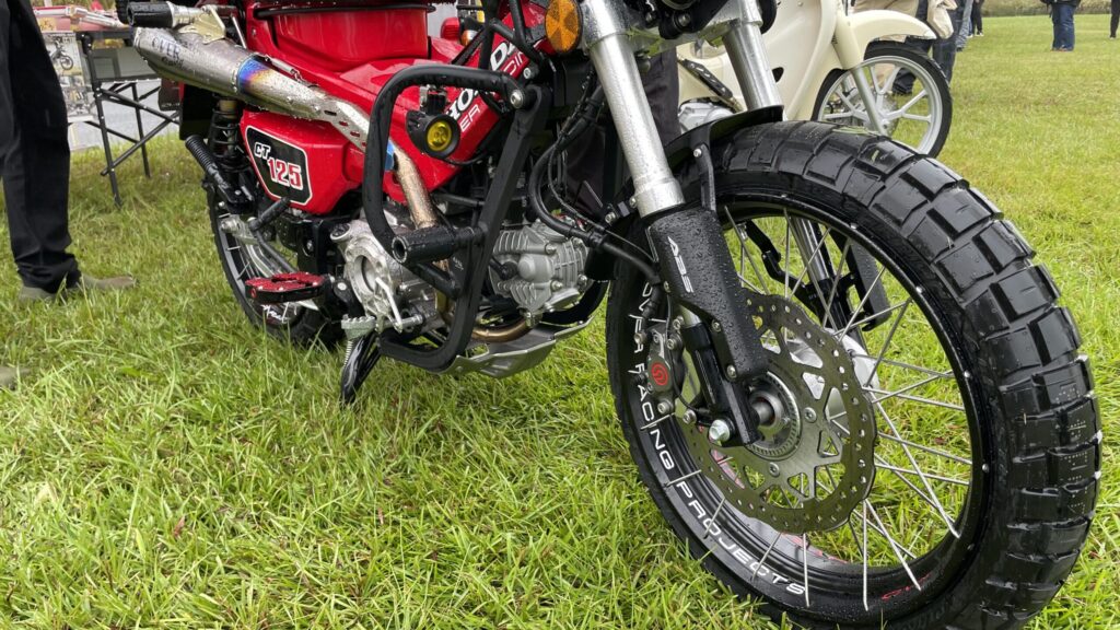 前後の見た目はこんな感じです。ハンターカブにはスポークホイールが一番似合います。クッション性も良いし、オフロードを走るならスポークホイール一択です。