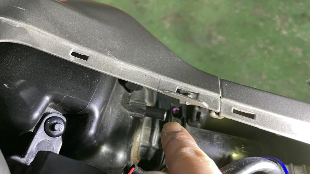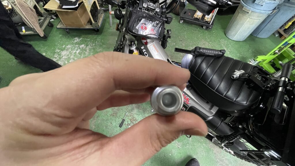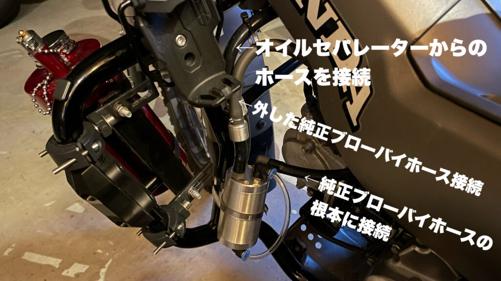 センターカバーを外して純正のブローバイホースを外してエンジン横から引き抜きます。サイドカバーを外せば簡単に取り出し出来ます。