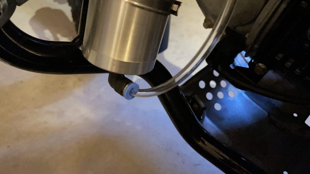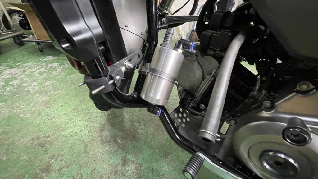 続いてブローバイガスに含まれた水分を貯めるタンクをエンジンガードに固定します。固定するためのバンドも全て付属しています。タンクは出来る限り真っ直ぐに固定するのが良いのですが、多少傾いてても問題ありません。