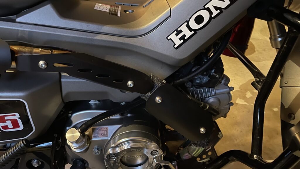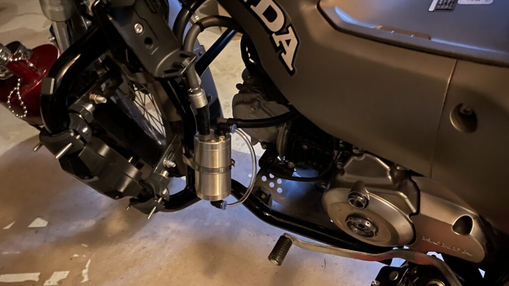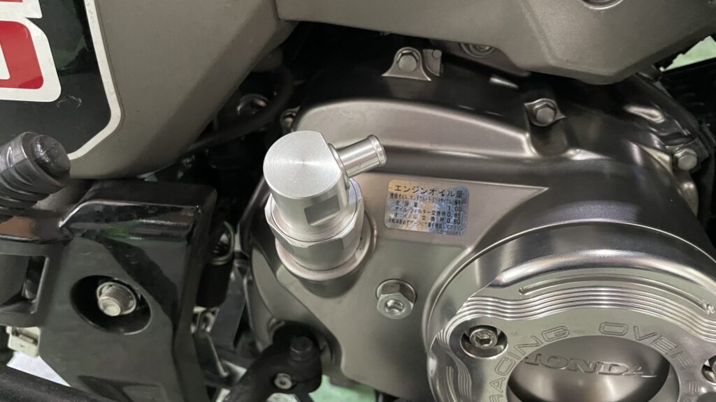 ハンターカブにポン付け出来るツインキットですが、純正のブローバイラインに加えて、クランクケースからも直接ブローバイガスを抜いており、より効率的な減圧が可能になっています。エンジンは関係ないのでJA55、JA65どちらでも取付出来ます。