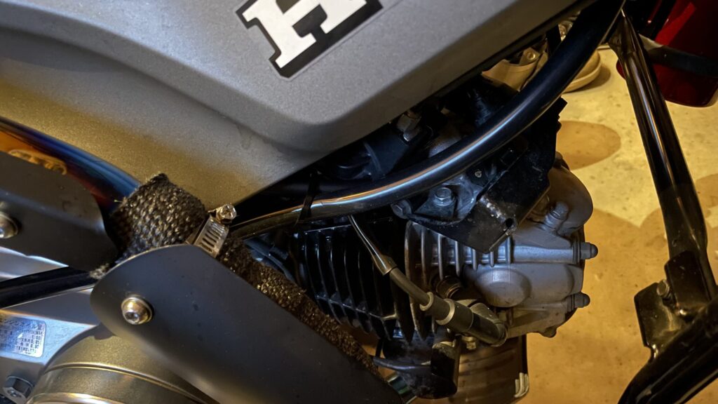 オイルセパレーターからのホースをマフラーの下を通してタンク側に回します。シリコンホースなので多少の熱には耐えれますが、必要であればマフラーに耐熱バンドなどを巻いて置くと安心です。