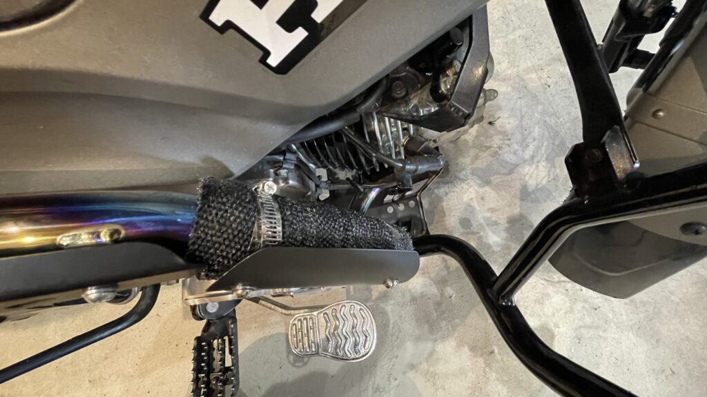 耐熱バンドもしっかり巻いたので、熱に関しては遮断できていますが、フルチタン製のマフラーの焼き目が隠れてしまっているのが残念でなりません。