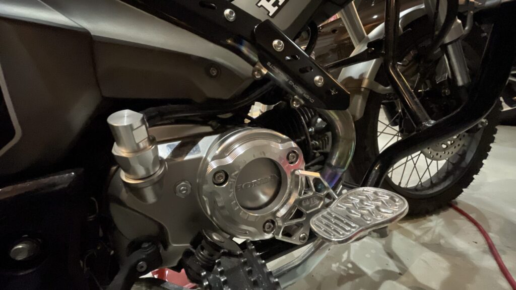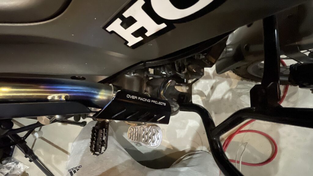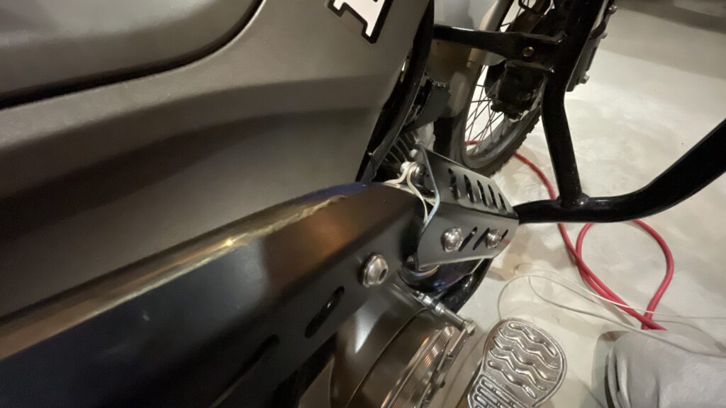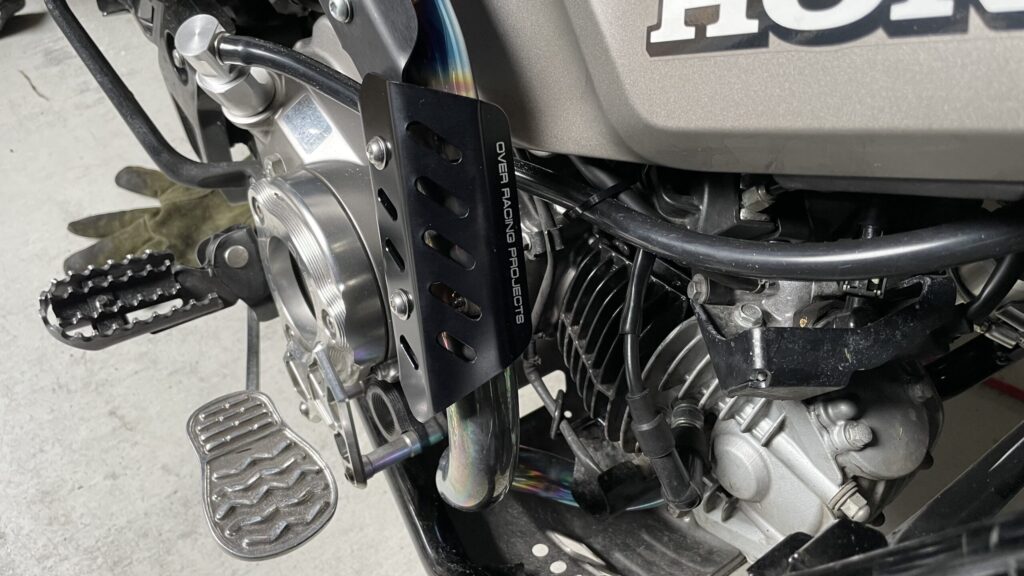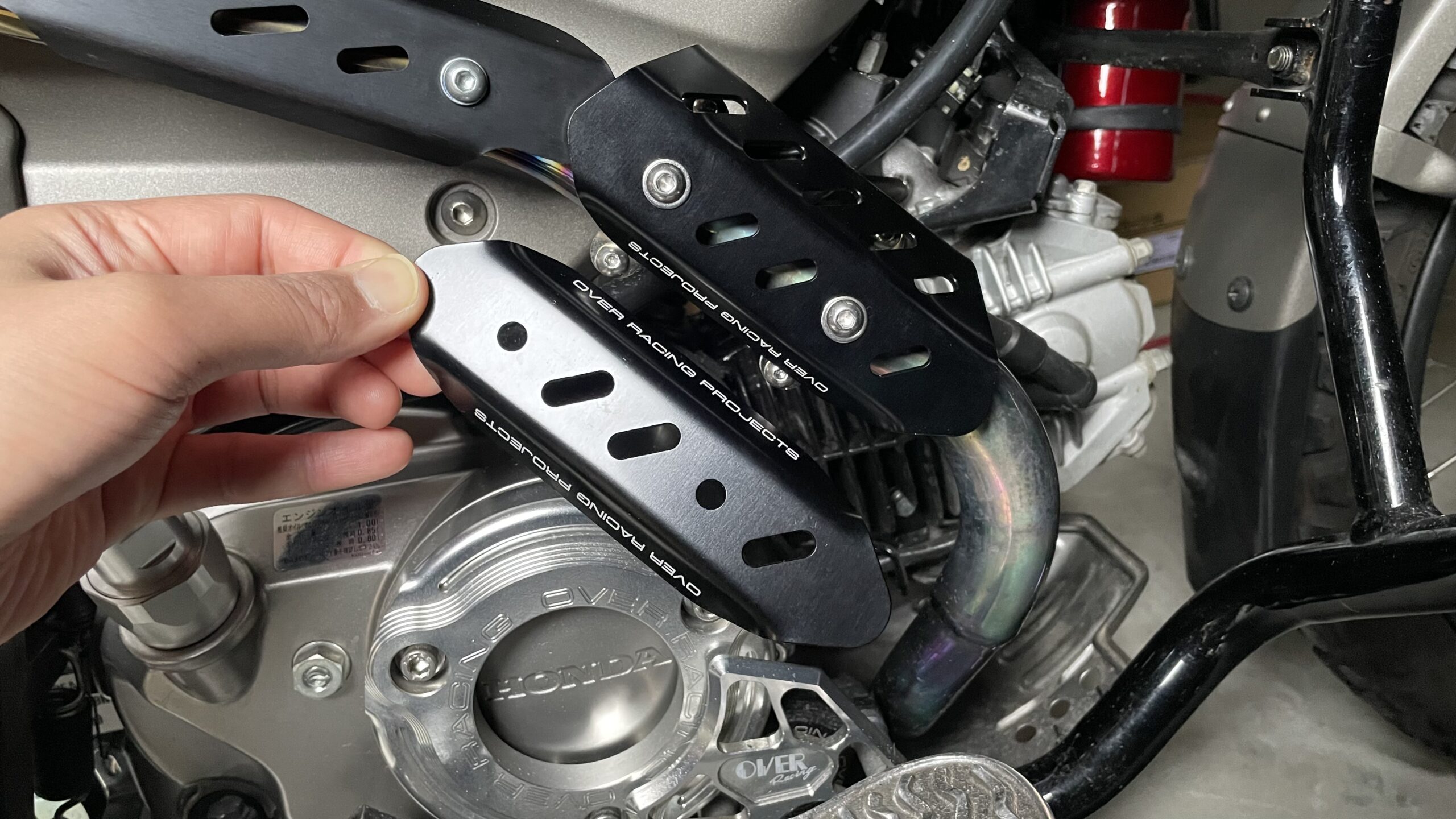 近くで見るとこんな感じです。OVER Racingのマフラーガードは肉抜きされてるのですが、汎用マフラーガードは穴が空いてないので、見た目のバランスが悪いのが難点です。