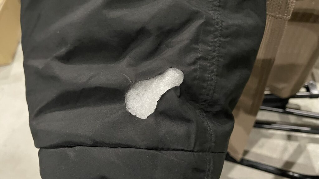 破れたズボンで走るのは恥ずかしいので、しばらく他のズボンを履いていましたが、運転中に焦げ臭い匂いを感じたのでズボンを見たら、前回と同じ場所が溶けていました。