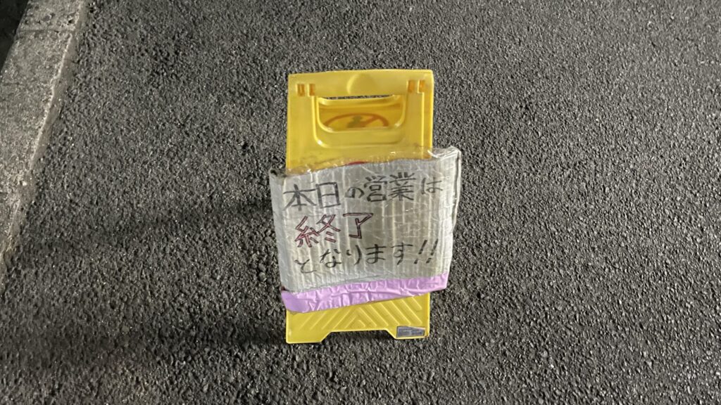 その時点で20時前だったと記憶していますが、この看板を後ろに置いてある状態でも、後から来た客が並んだりするので、若干気まずい雰囲気で待たされました。