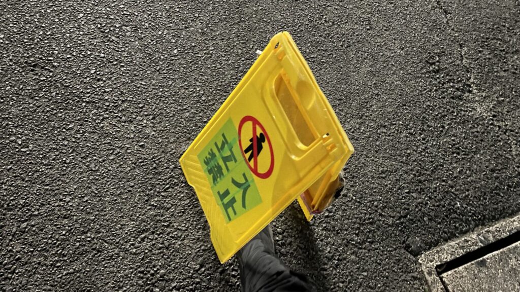 真冬で風が強い日だったので、足で押さえてないと看板が倒れるし、看板のお世話が大変でした。