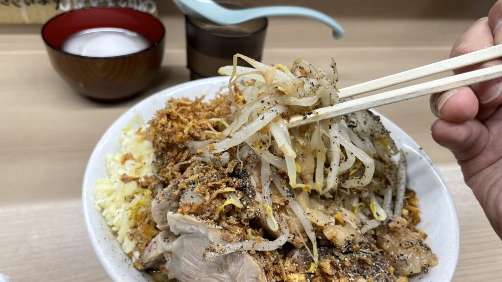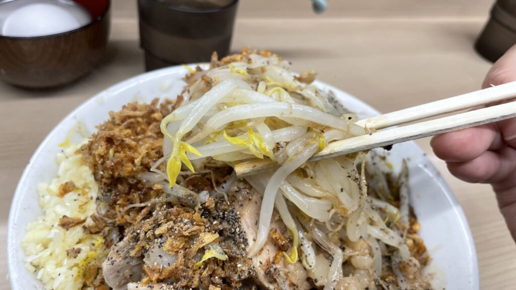 程よい硬さで茹でられたモヤシから食べましたが、アブラの甘味と野菜の甘さが融合して、食欲のスイッチがオンになりました。