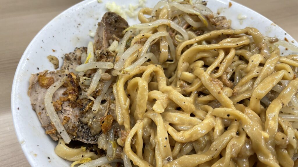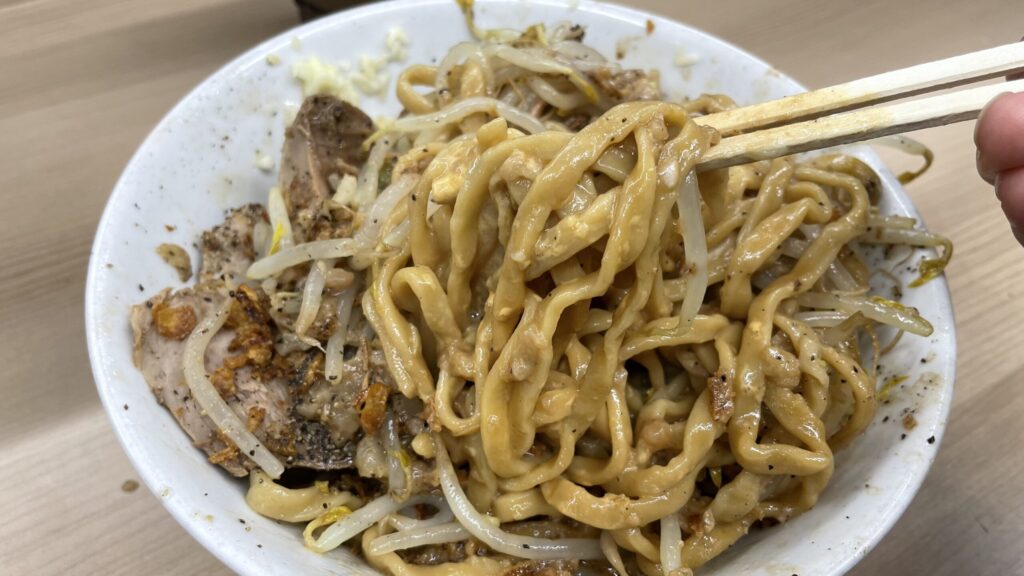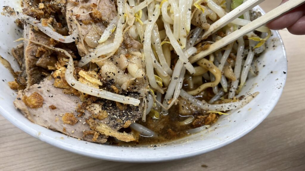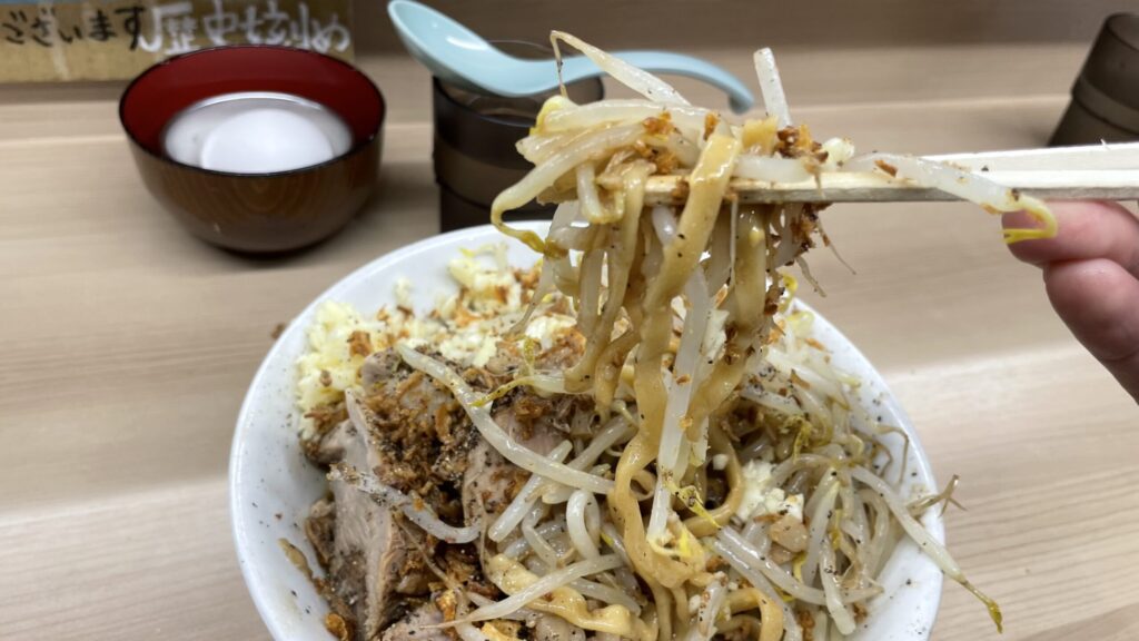 モヤシのシャキシャキ感と麺のワシワシ感が合わさると、至福の時間が訪れます。