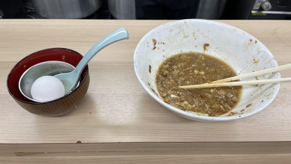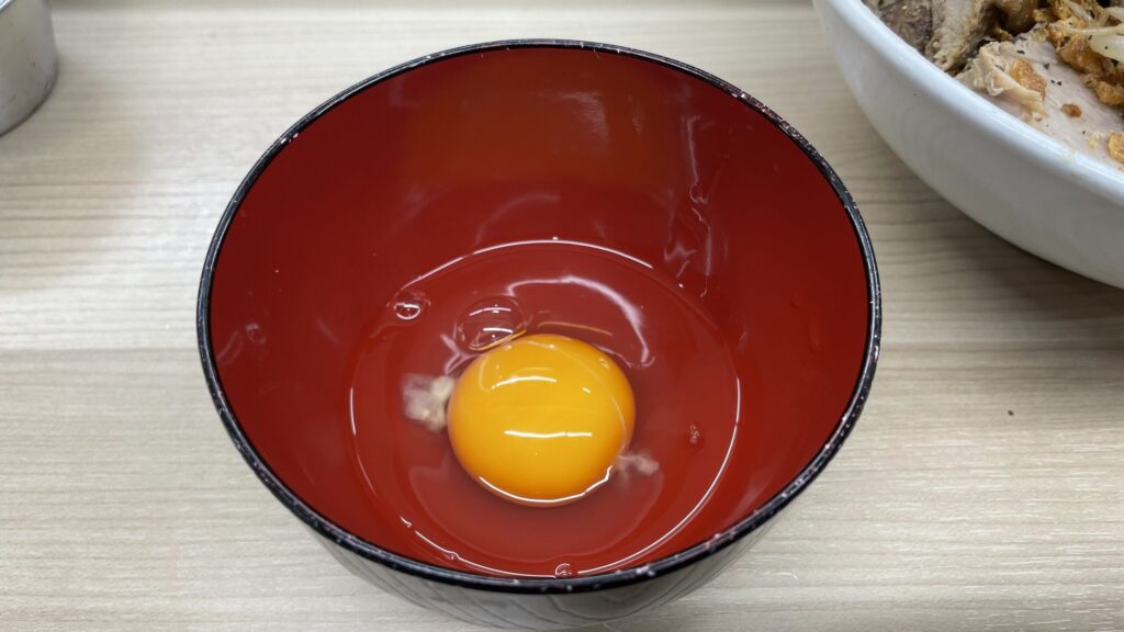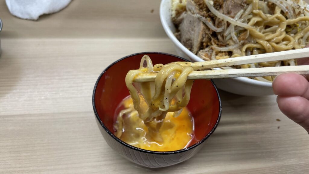 卵に麺をくぐらせたら麺の熱さも和らぎ、マイルドな味に変化します。