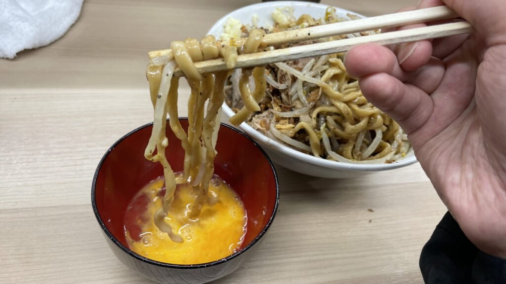 かき混ぜた卵にアブラギトギトのワシワシ麺を浸していきます。