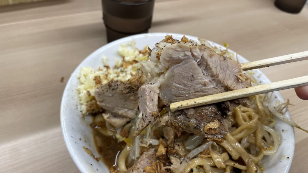 豚1枚でこの分厚さです。チャーシューというより豚の塊を食べている感覚で、食べ進めていくと脳汁も全開になります。