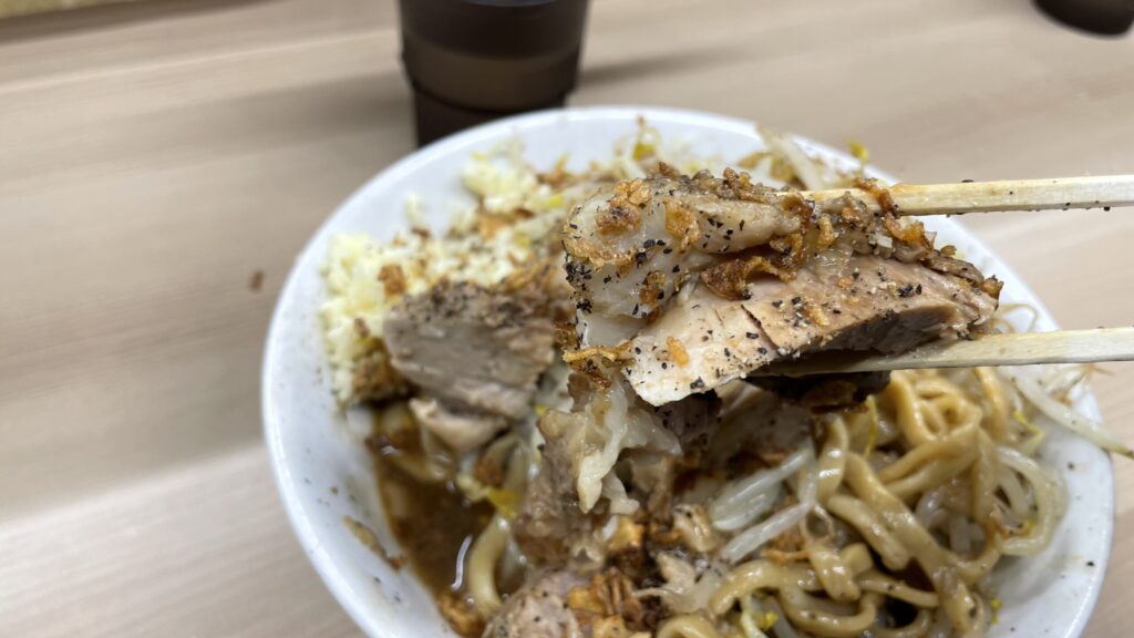 汁無しラーメンの場合、豚がスープに浸って無いので噛みごたえがしっかりしており、顎が鍛えられます。