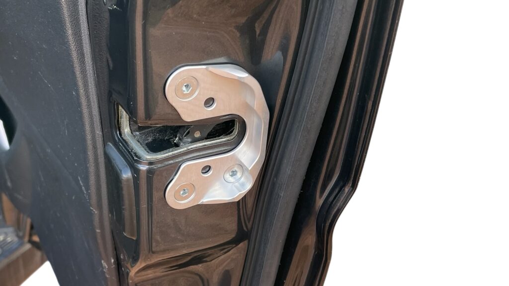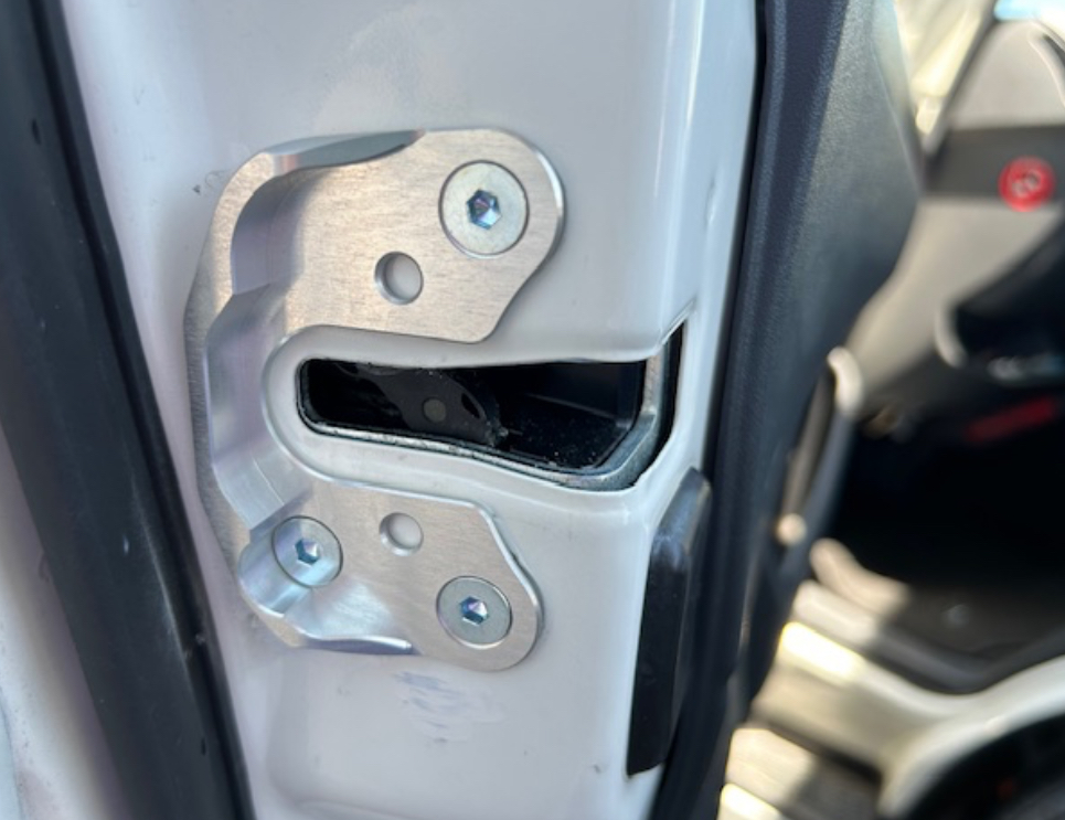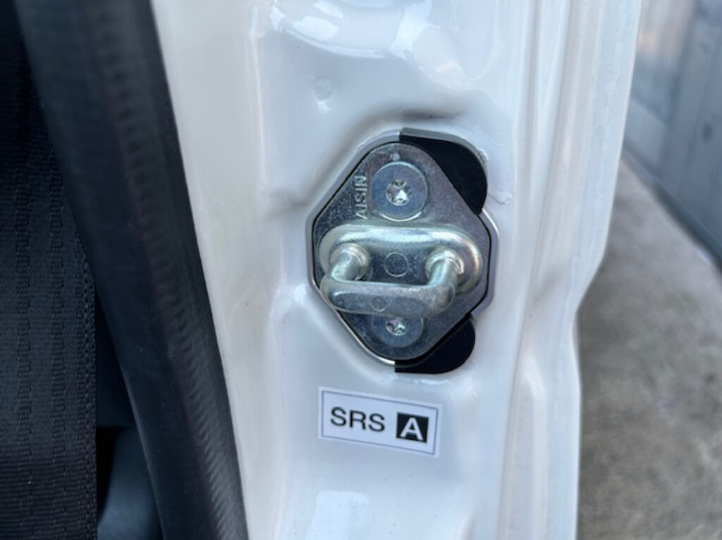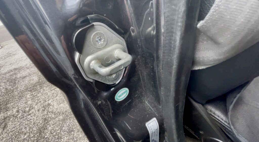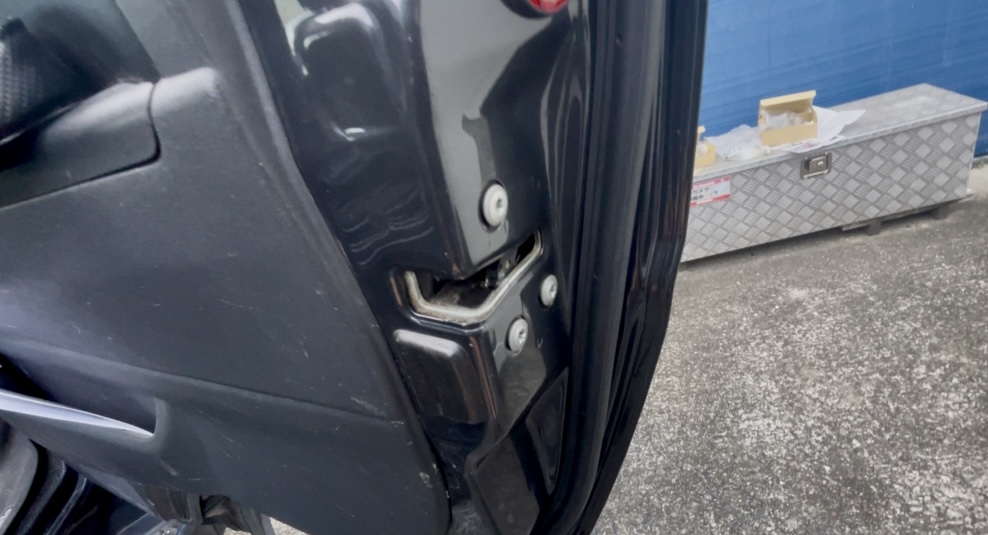 ドアを閉めてしまうと見えなくなる部品ですが、ドアストライカーを装着するとボディ側とドア側が上記の写真のように重なります。