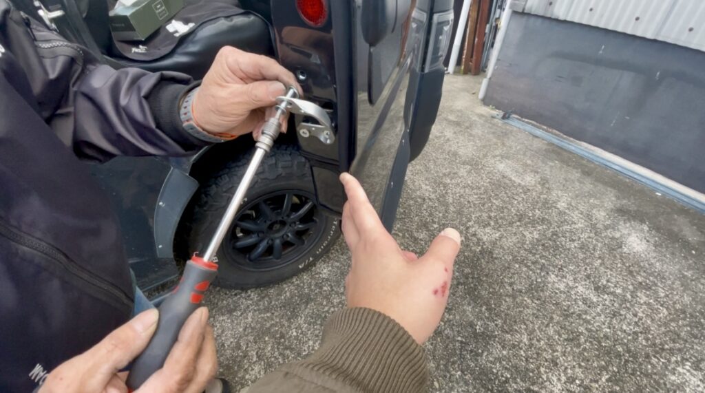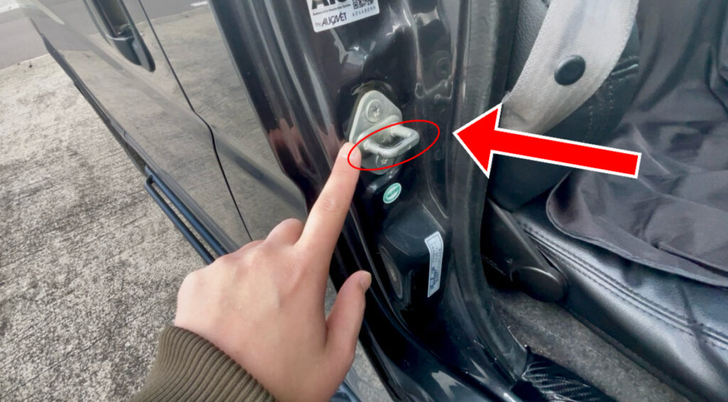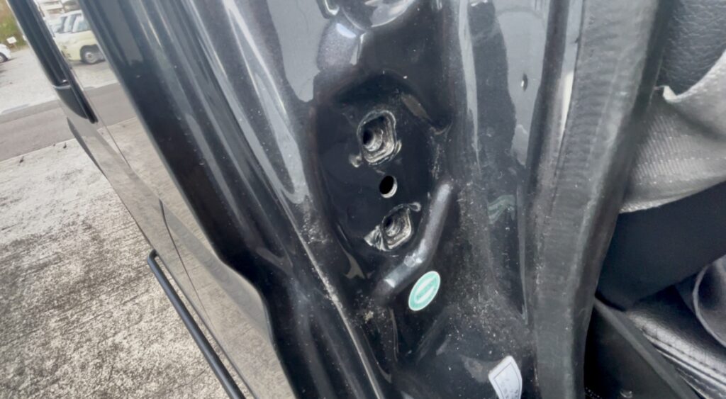 純正状態だと上記写真の赤丸部分で『点』でドアが引っかかっているだけなので、走行時や悪路を走った際に上下左右にガタツキが生じます。