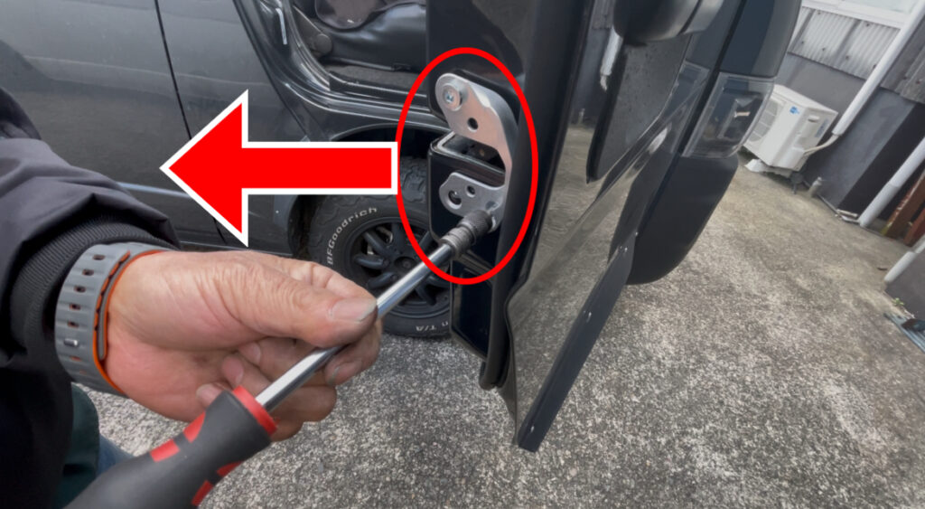 最初にドア側の部品を車内側に寄せてネジを仮固定します。