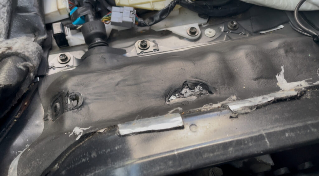 ハイエースのシートを跳ね上げ、エンジンルームにアクセスします。