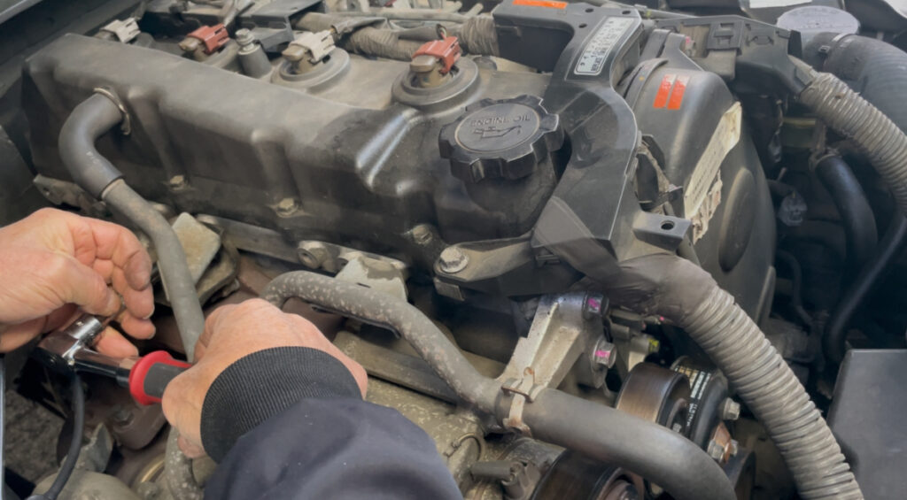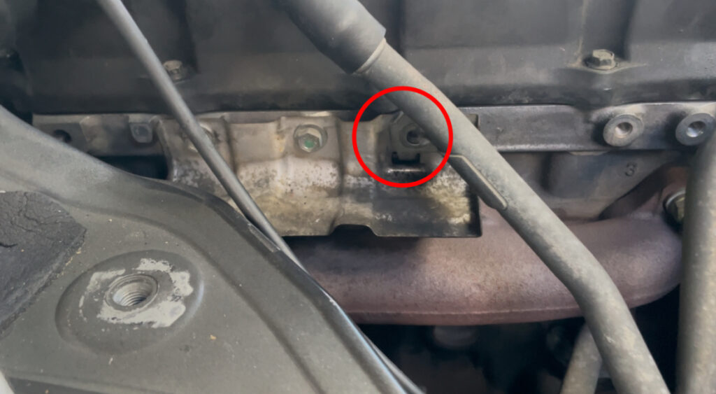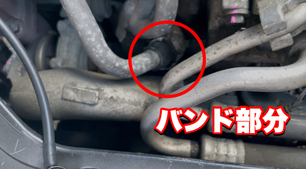 エンジンカバーを外したら、ブローバイパイプを固定してあるステーのボルトを1箇所外します。