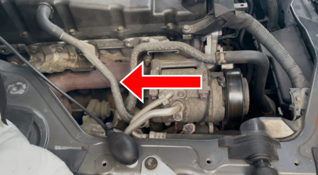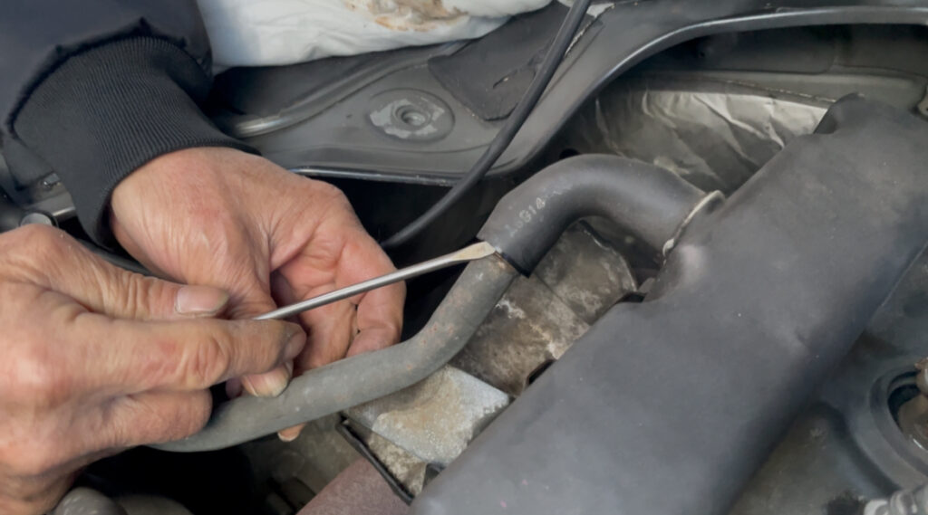 赤矢印部分のブローバイパイプを抜いていくのですが、年式が古い場合ゴムが劣化している恐れがあるので、パーツクリーナーを少量吹きかけてからマイナスドライバーを差し込みパイプを抜いていきます。