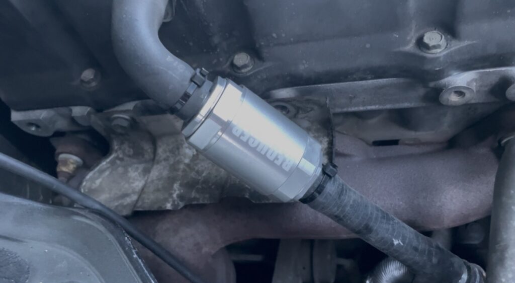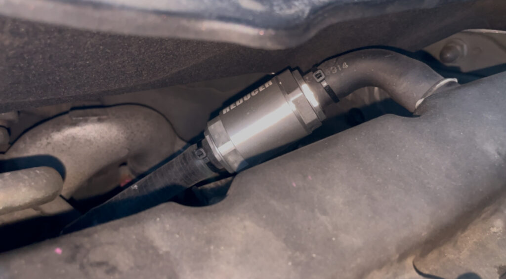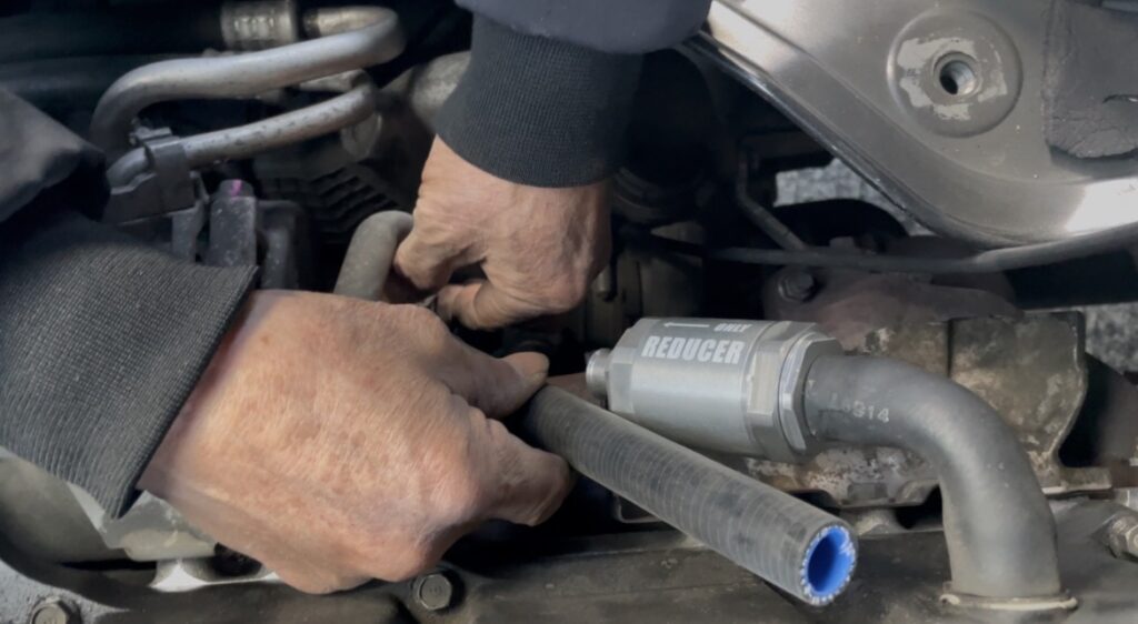 ブローバイパイプを外したら、レデューサー本体とホースを取付します。下側はストレートジョイント(付属部品)をホースに差し込んでからバンドで再固定します。